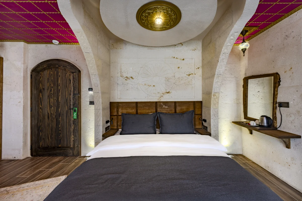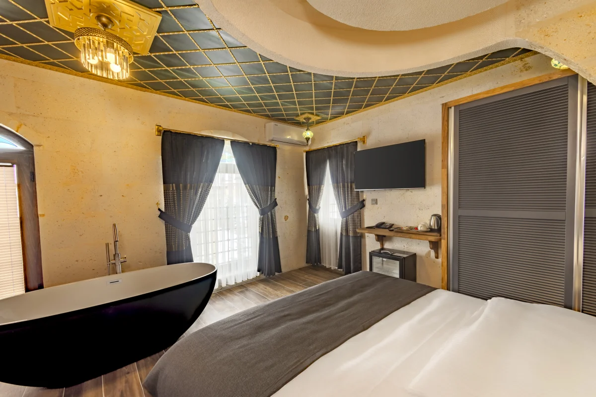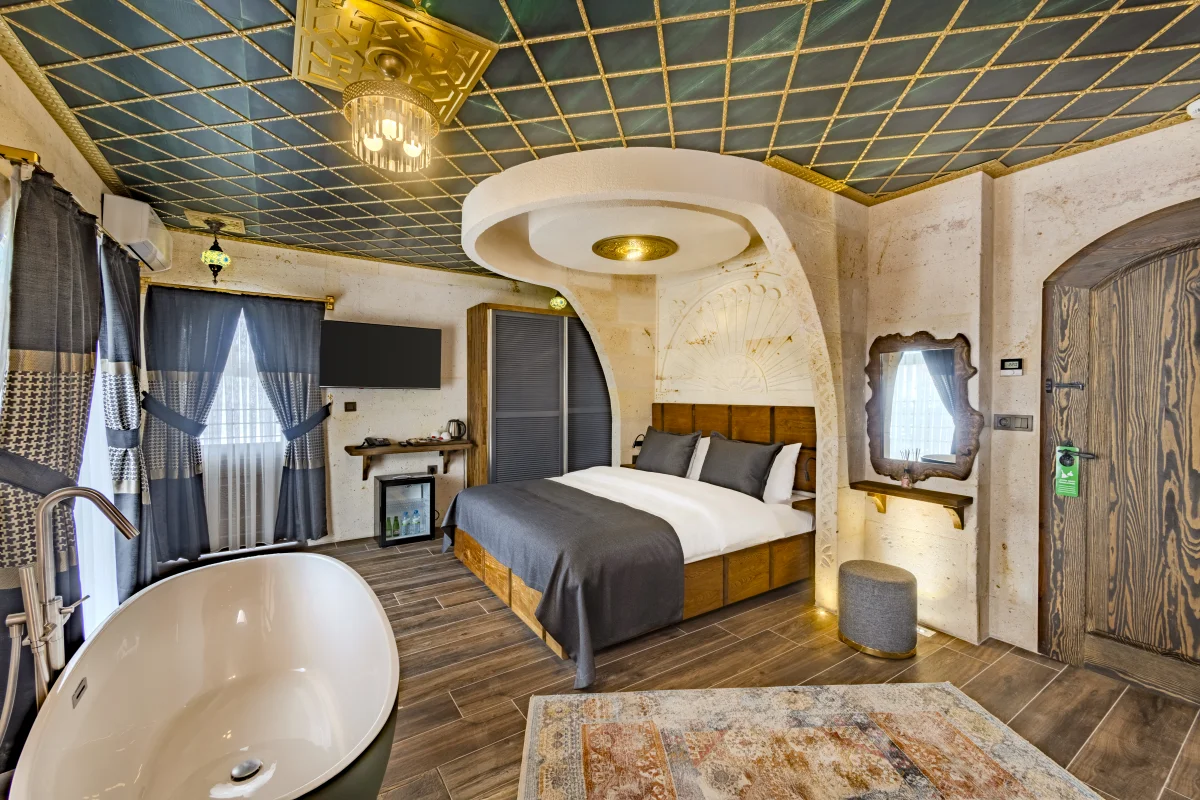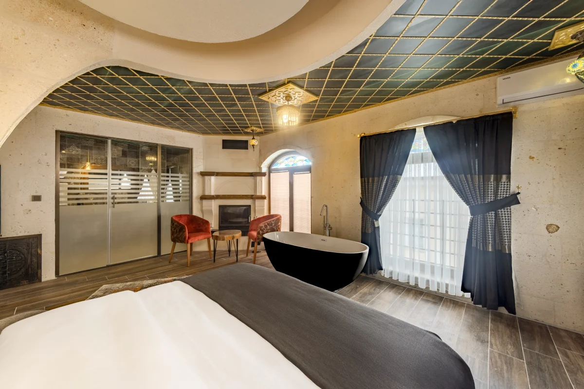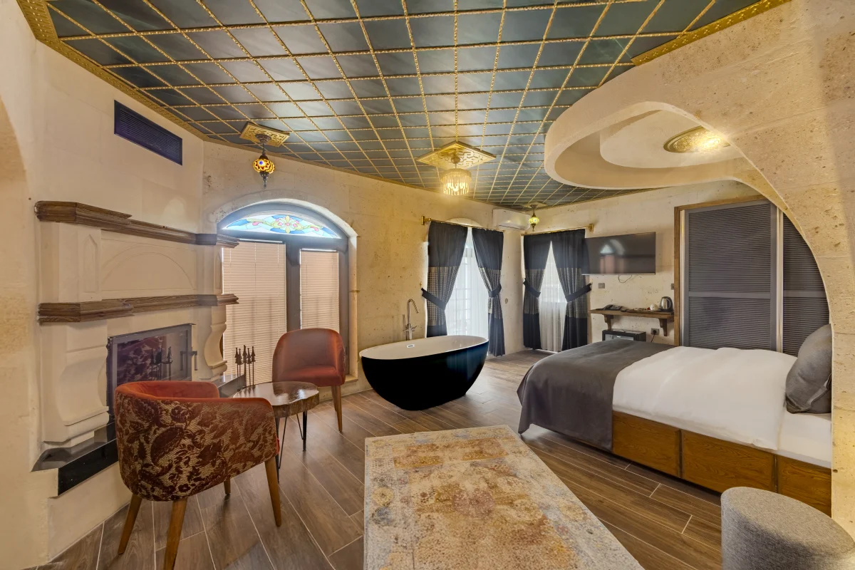 Şömine başında romantik anlar, balkondan büyüleyici manzara ve özel jakuzi keyfi.