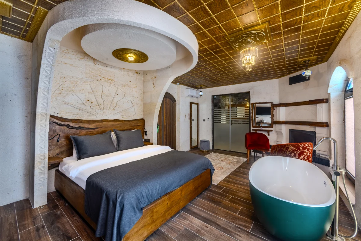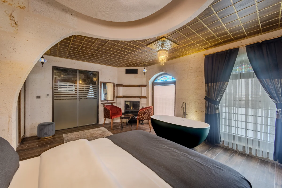 En geniş odamız. Şömine, özel jakuzi ve balkon ile premium deneyim yaşayın.