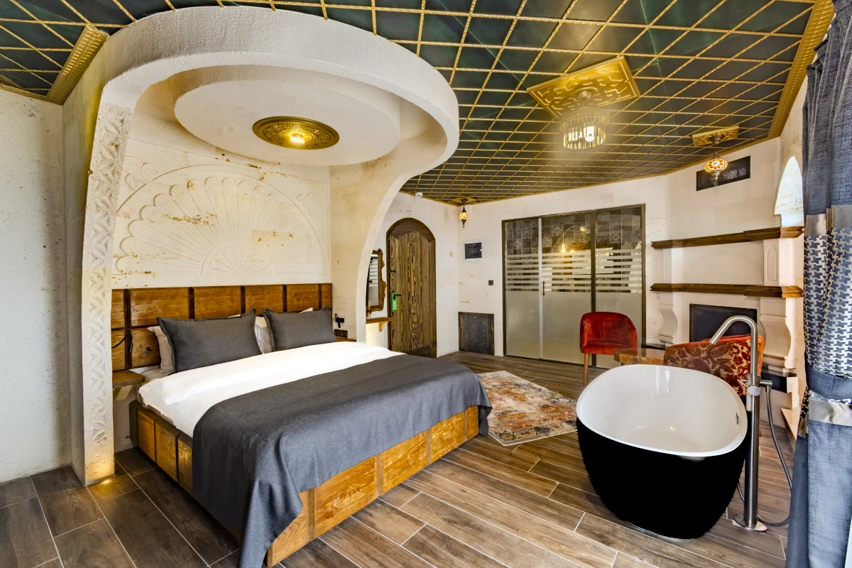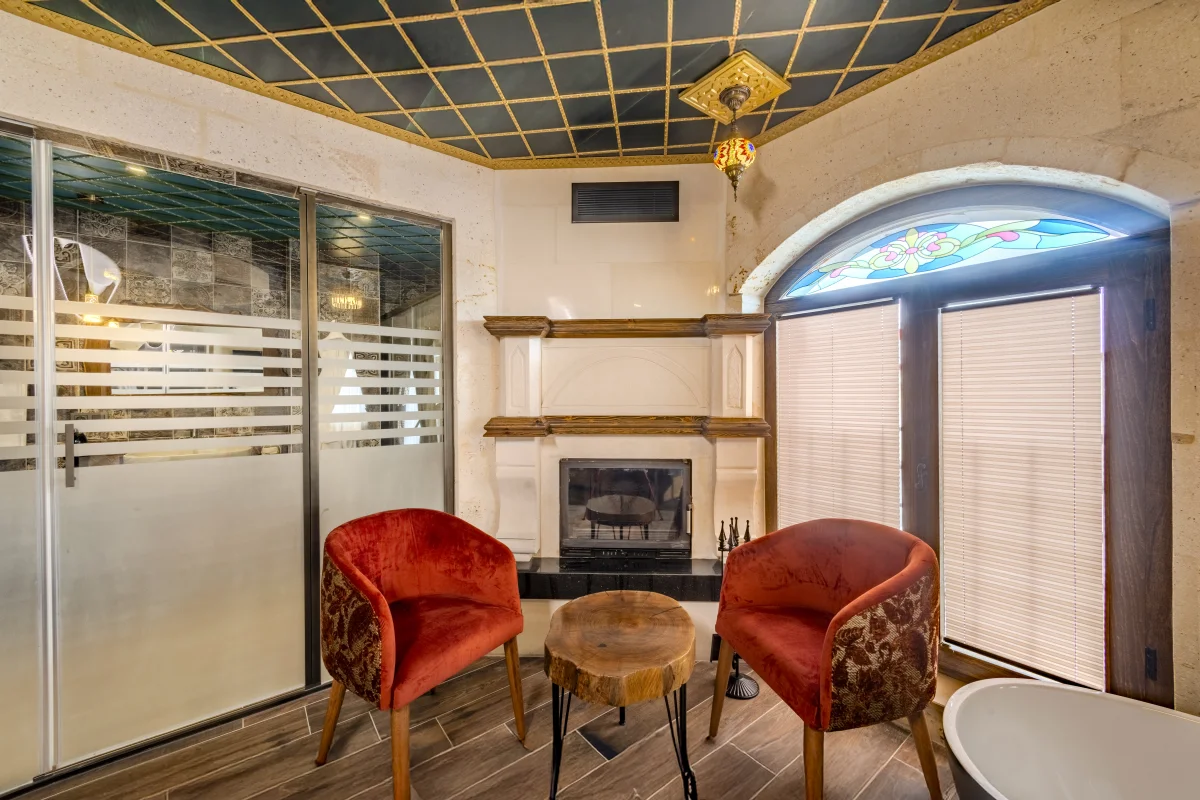 Şömine başında romantik anlar, balkondan büyüleyici manzara ve özel jakuzi keyfi.
