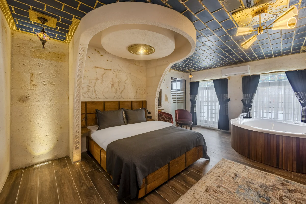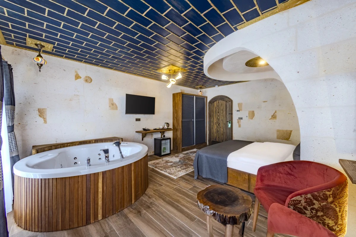 Özel spa küveti ve şömine ile romantik atmosfer. Rahatlama ve konfor bir arada.