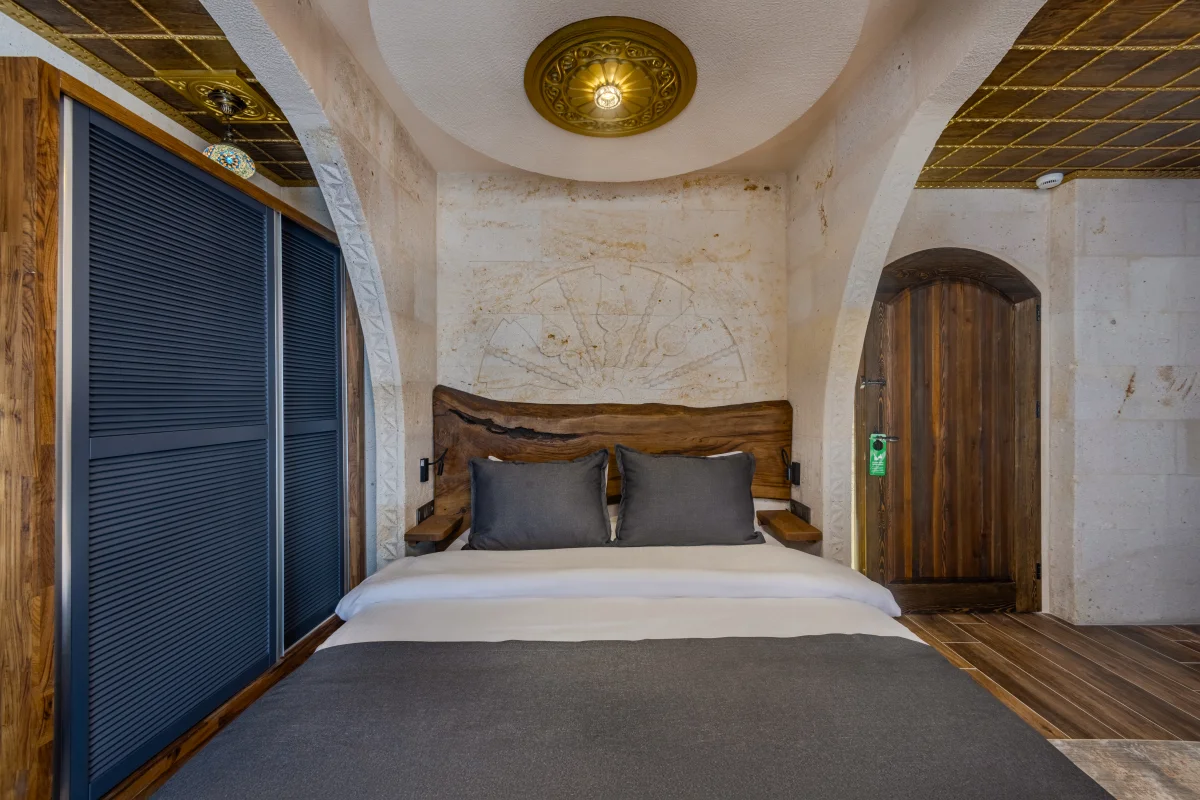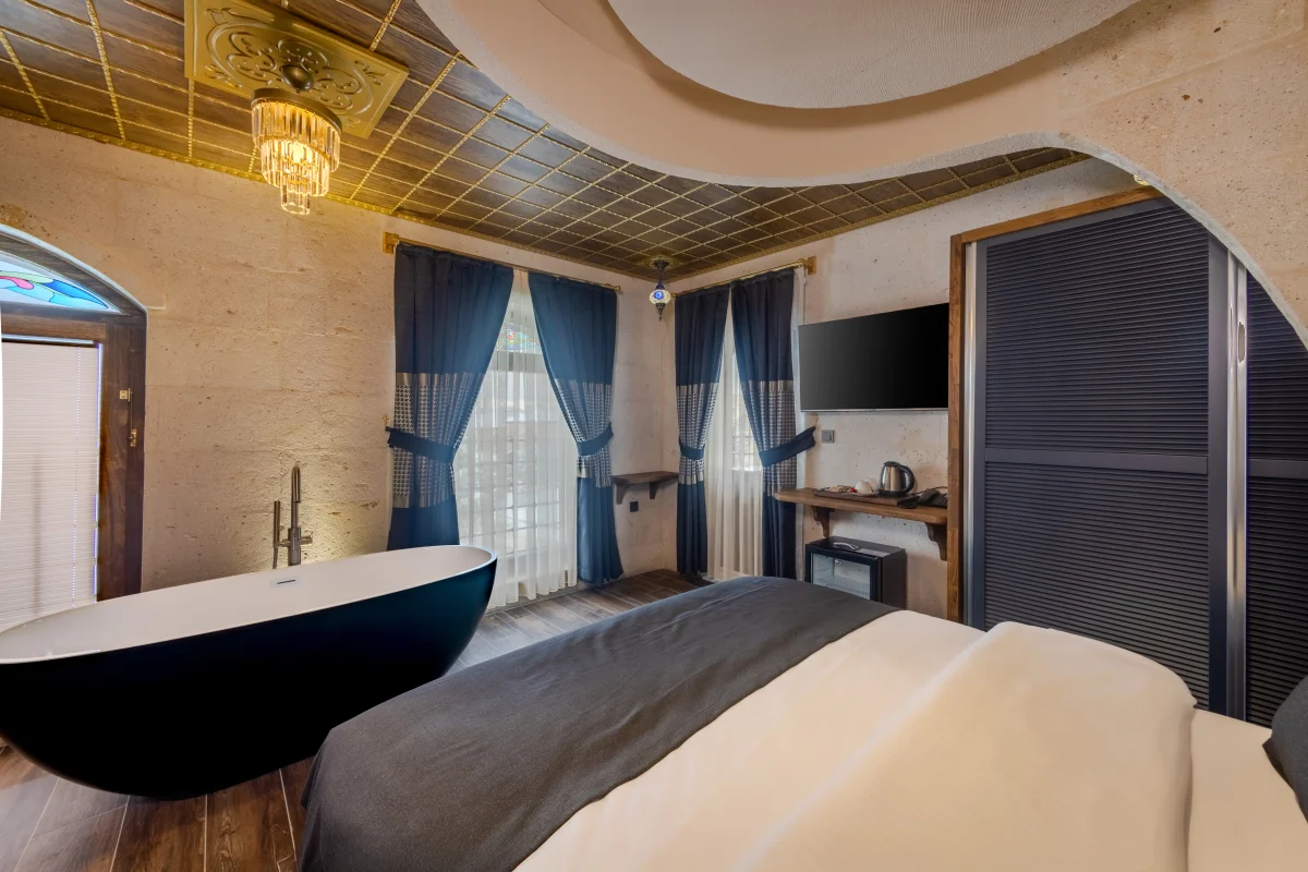 En geniş odamız. Şömine, özel jakuzi ve balkon ile premium deneyim yaşayın.
